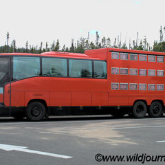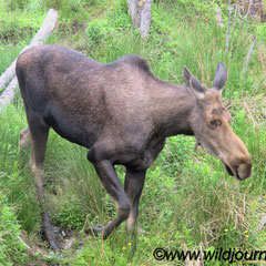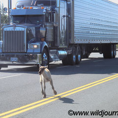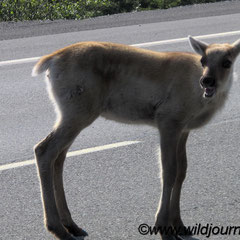 Grad, als ich beginne mich davon zu erholen, steht mitten auf der Straße ein winzig kleines Kälbchen, ein Karibou! Ich glaube sofort zu wissen, zu wem es gehört. Es blökt jämmerlich und ist schon dehydriert. Trucks kommen an gerast, bremsen jedoch in letzter Minute, viele halten an und versuchen das Kalb von der Straße zu vertreiben, selbst hartgesottene Motorbiker springen ab und geben ihr Bestes. Mir ist klar, bringt alles nix, hier hat es die beste Übersicht und wird deshalb auf keinen Fall im angrenzenden Wald bleiben, ein aussichtsloses Unterfangen. War dies die Mutter was sehr wahrscheinlich ist, ist das Schicksal des Kleinen besiegelt. In dieser Gegend sieht er im Herbst hunderte von ihnen ziehen, erzählt mir ein Einheimischer. Er bleibt dort, ich ziehe auch weiter..